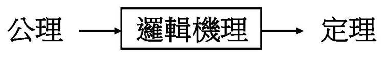 這是指在前二者的信心中使用邏輯,信心是必須有的。如果一個人不在信心中純用邏輯,結論是不可知論(agnosticism)。我們首先來看看我們邏輯只是一個工具而已,用不同的公理送入同樣的邏輯機理會得到不同的結果,也就是可用圖一來示意表示。邏輯的機理是大家都一樣的,為什麼呢?以發表論文為例,如果每個人都不一樣,怎麼能審查論文而決定能不能發表呢?可見邏輯機理是一樣的。雖然如此,每個領域用的公理是不同的,得到的定理也不同。